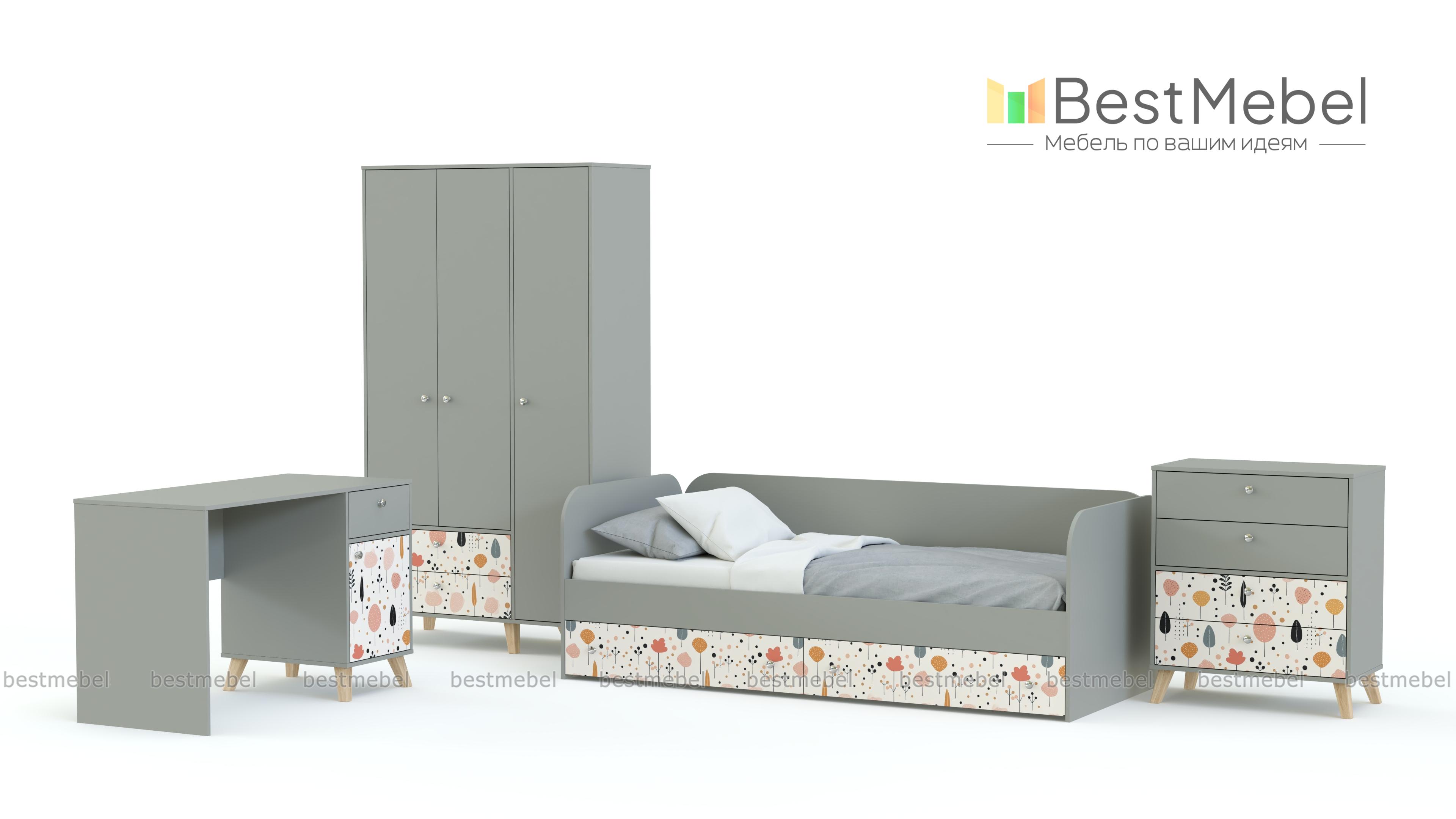 Детская комната Эльза 4 BMS создает пространство для отдыха, игр и учебы с удобной системой хранения. В комплекте уютная кровать-софа со скругленными спинками и письменный стол, а для размещения одежды, постельного белья и всевозможных мелочей предусмотрены трехдверный шкаф с ящиками и комод. Светлый оттенок мебели универсален, а индивидуальности интерьеру добавляет стильный пастельный принт. Купить детскую комнату Эльза 4 BMS с учетом необходимых размеров вы сможете на сайте нашего интернет-магазина.