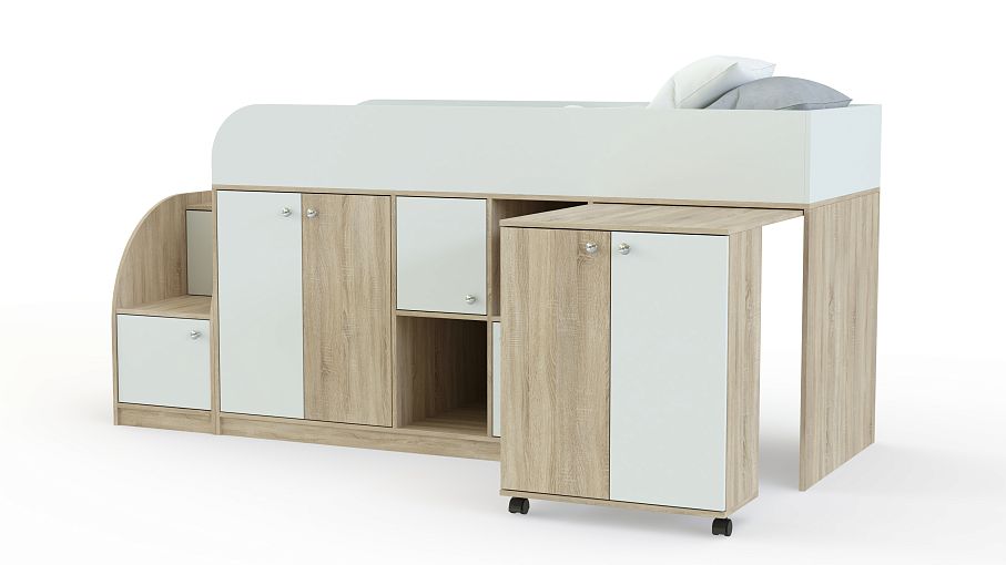Кровать-чердак Астра мини BMS отличается высокой функциональностью, занимая минимум места. Эффективно использовать пространство детской поможет современная конструкция, включающая в себя комфортное спальное место и множество разноплановых отделений. Под кроватью второго яруса с защитными бортиками располагаются распашные отделения, ниши и выкатной столик с тумбой. Небольшая устойчивая лестница также представляет собой стеллаж и удобна для хранения игрушек. Купить кровать-чердак Астра мини BMS, которая порадует ребенка ярким дизайном, приглашаем в наш интернет-магазин.