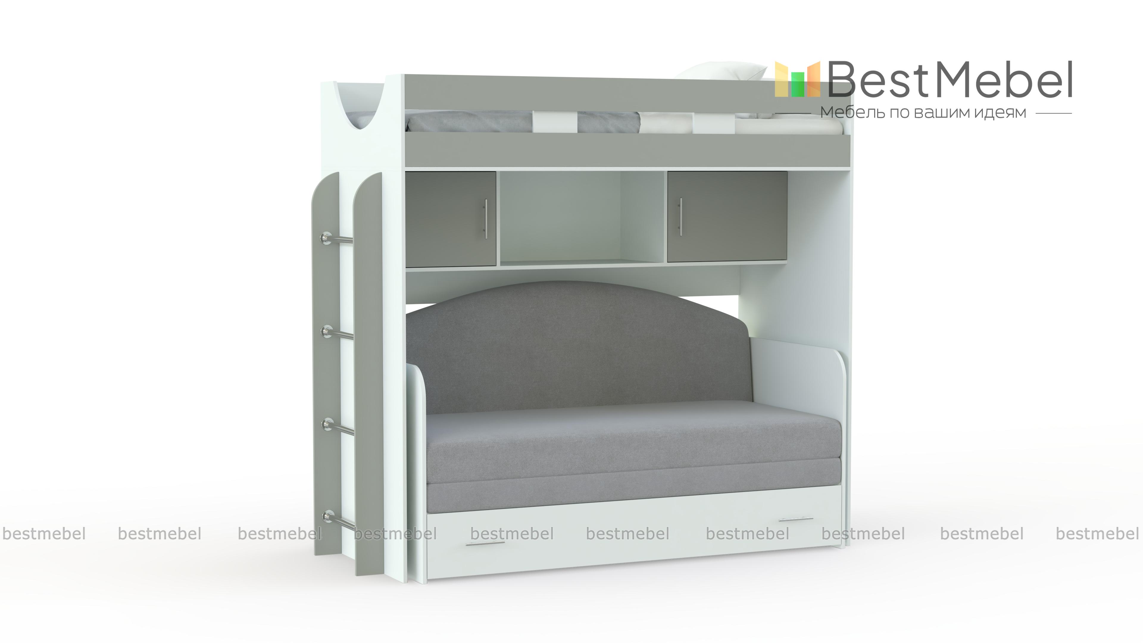 Кровать-чердак с диваном Пума 4 BMS станет отличным вариантом для организации пространства небольшой детской. Двухъярусная композиция, объединившая зону отдыха с удобной системой хранения, позволит сэкономить полезную площадь для игр. На втором ярусе располагается спальное место с бортиком, на первом – мини-диван и книжные полки, а с торца – вертикальная лестница с хромированными перекладинами. Купить кровать-чердак с диваном Пума 4 BMS вы сможете в нашем интернет-магазине, подобрав цветовое решение для комнаты мальчика или девочки.