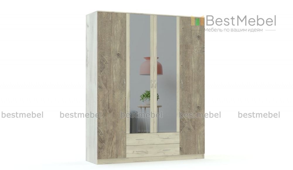 Распашной шкаф Ариэлла BMS выполнен в трендовых оттенках с имитацией фактуры дерева. Особенную вместительность четырехдверной модели обеспечивает комбинированная конструкция с распашными отделениями для белья и одежды и четырьмя  выдвижными ящиками. Зеркальные центральные створки сделают удобной примерку и позволят сэкономить на отдельном аксессуаре. Купить распашной шкаф Ариэлла BMS для комфортного интерьера с элементами экостиля вы сможете в нашем интернет-магазине.