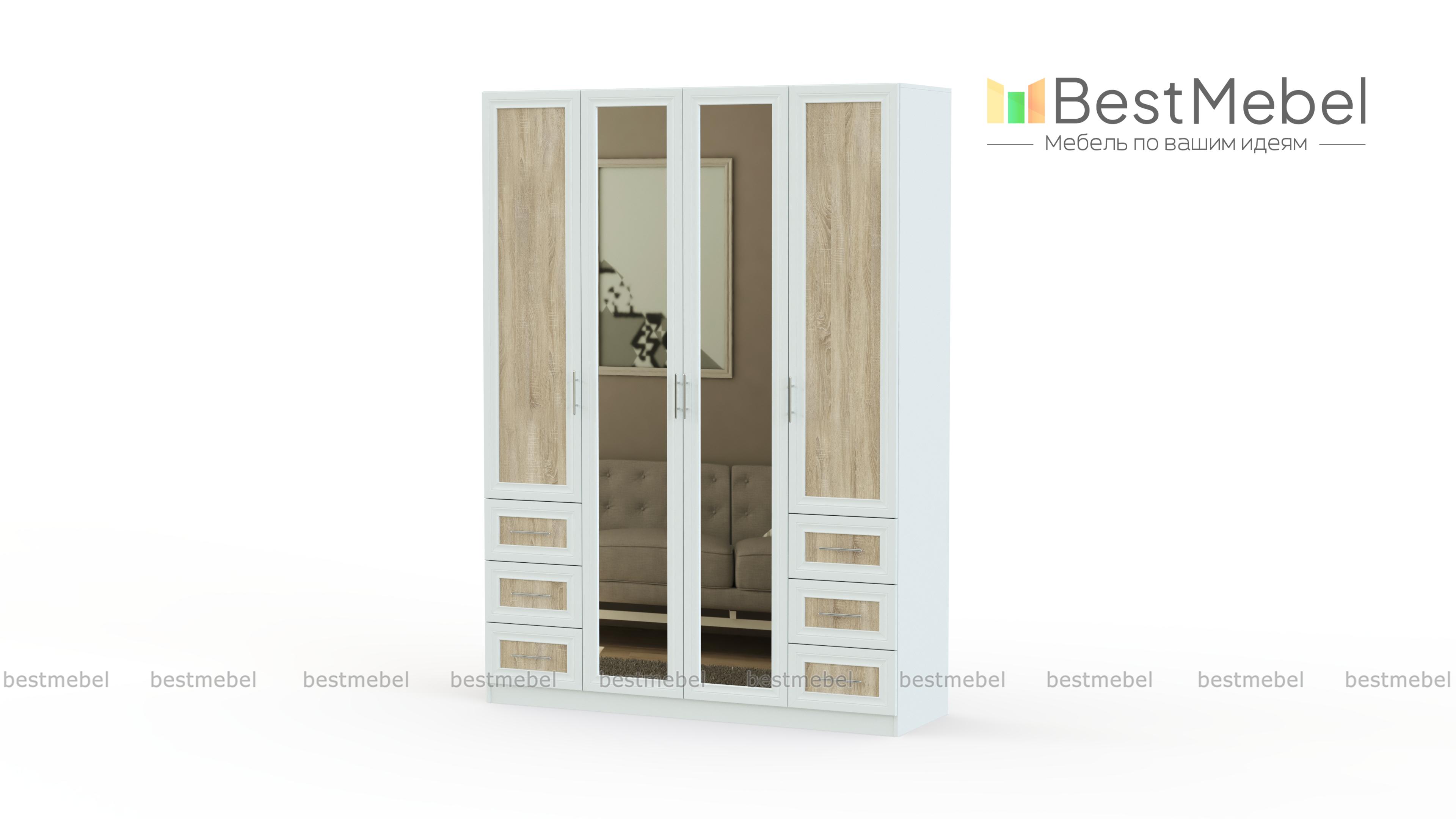 Распашной шкаф Крона 21 BMS поможет упорядочить хранение предметов гардероба и станет украшением домашнего интерьера. Элегантная модель с рамочными фасадами контрастных оттенков декорирована зеркалами в полный рост и смотрится легкой, несмотря на габариты. Четырехдверный шкаф оборудован центральным отделением со штангой и верхней полкой и двумя бельевыми секциями. Удобное дополнение – выдвижные ящики для мелочей в нижней части. Купить распашной шкаф Крона 21 BMS вы сможете в нашем интернет-магазине по приятной цене.