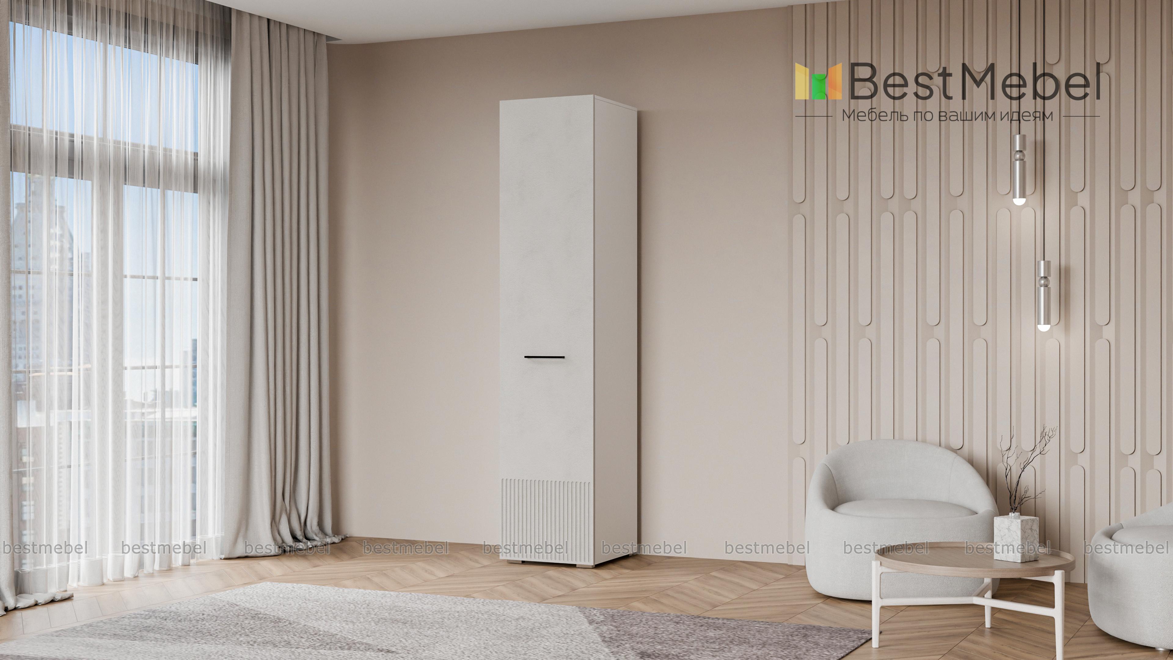 Шкаф распашной Декарт 1 BMS вы сможете использовать отдельно и в сочетании с другими шкафами серии. Пенал в светлом дизайне с фрезерованным декором идеально подходит для компактных комнат. Компоновка с вешалкой и верхней полкой — комфортная база для повседневных вещей, а распашная дверца со стильной ручкой-скобой обеспечивает им отличный обзор. Купить шкаф распашной Декарт 1 BMS приглашаем на сайт нашего интернет-магазина, по желанию изменив цвет и размеры.
