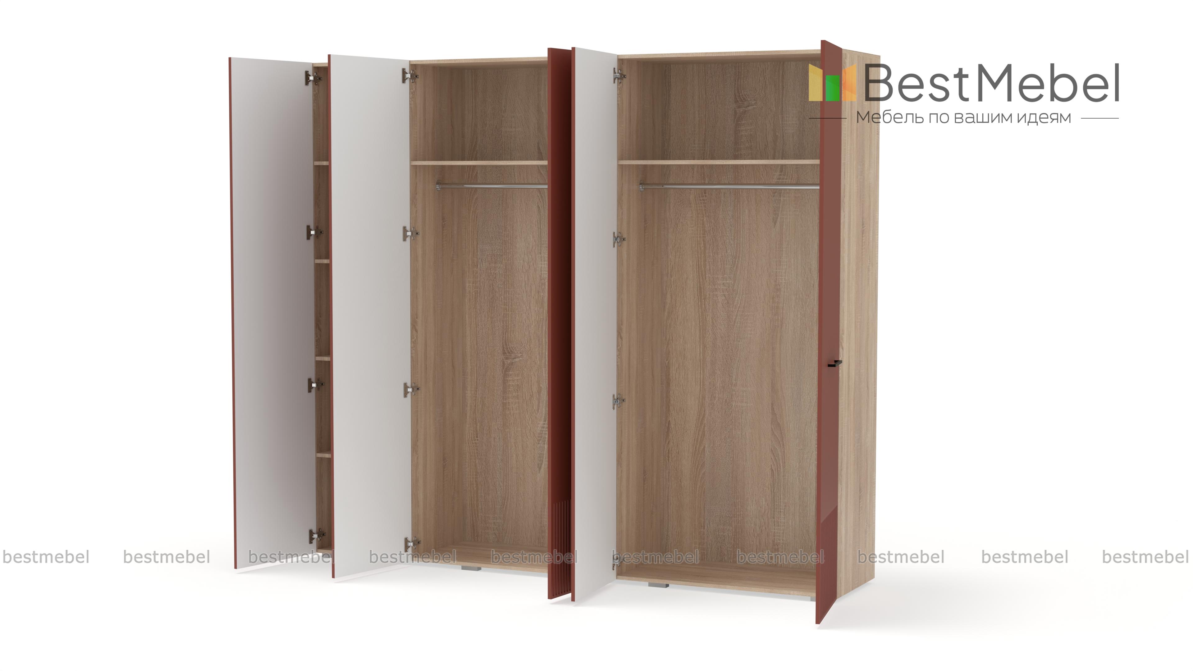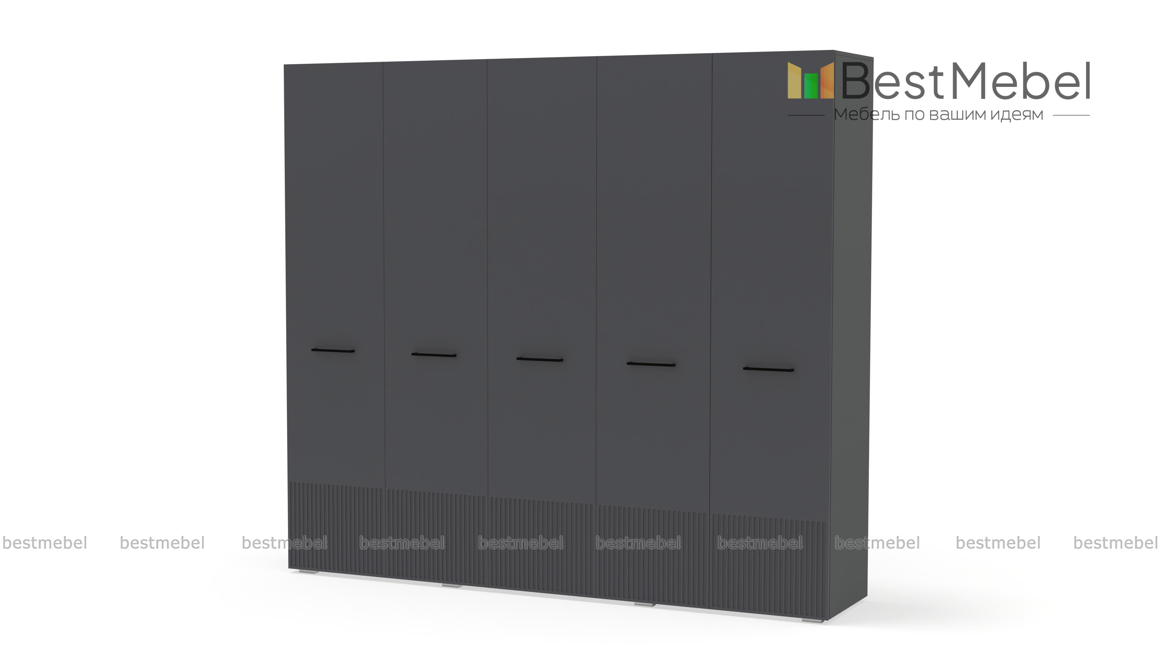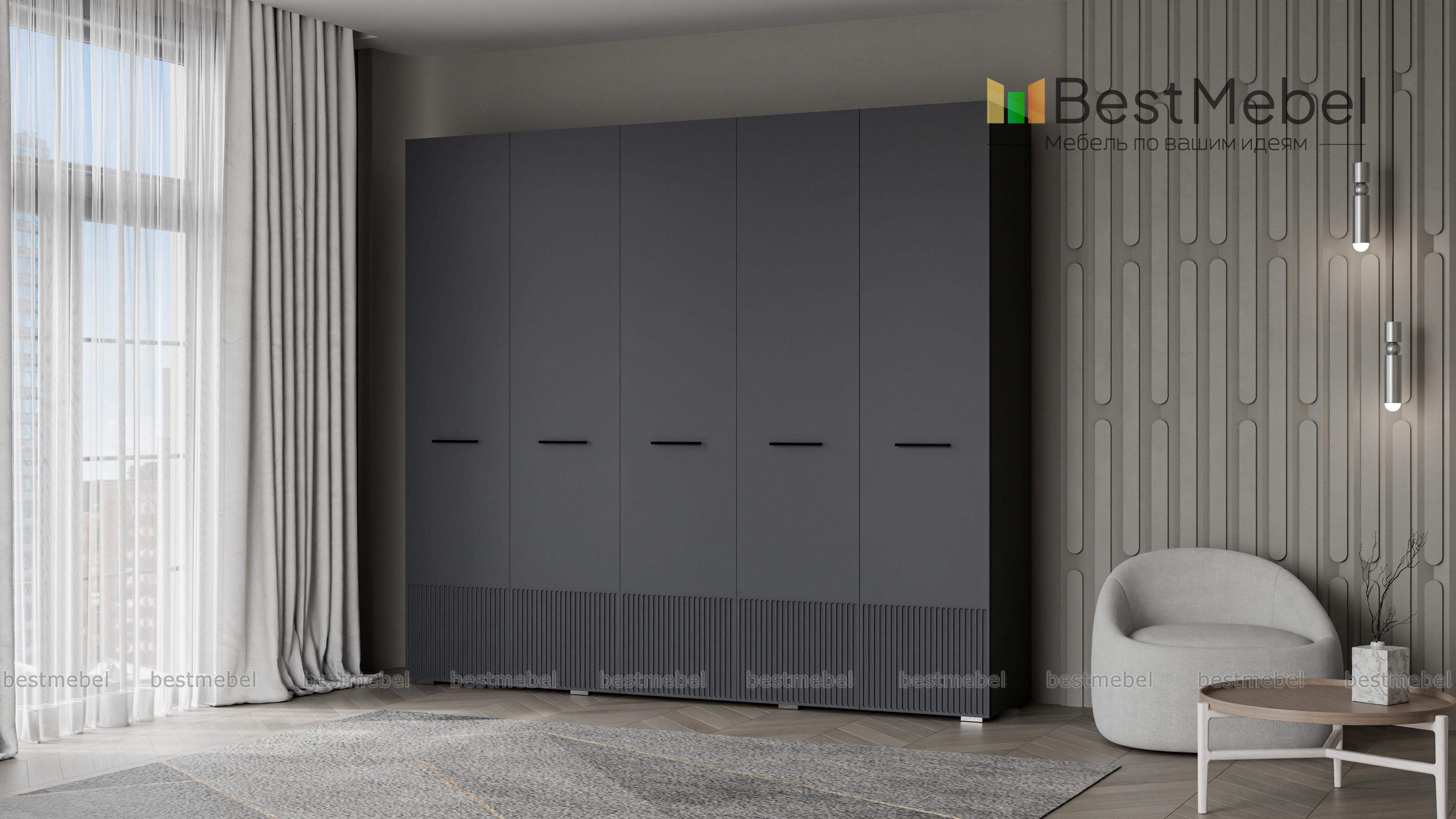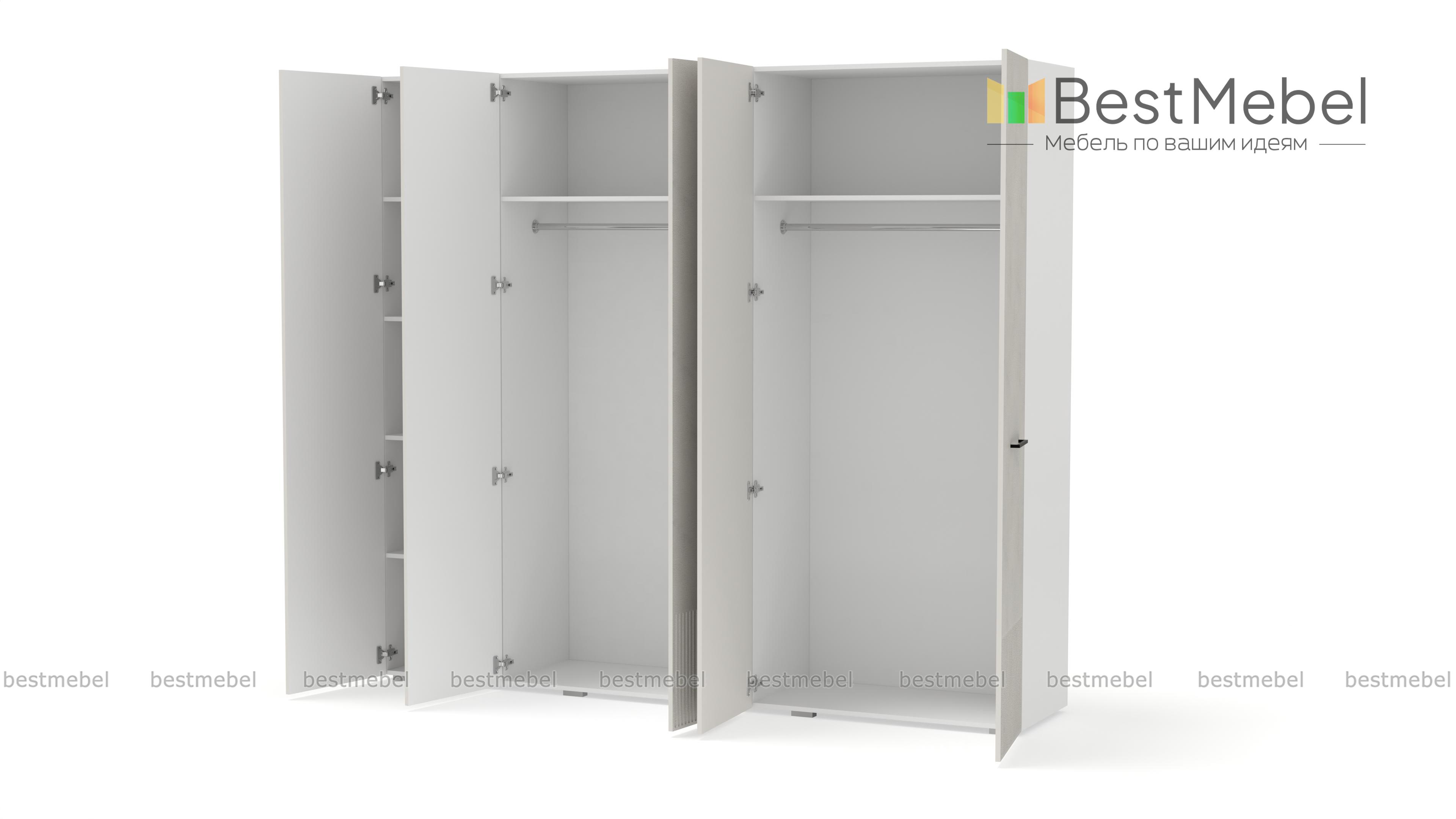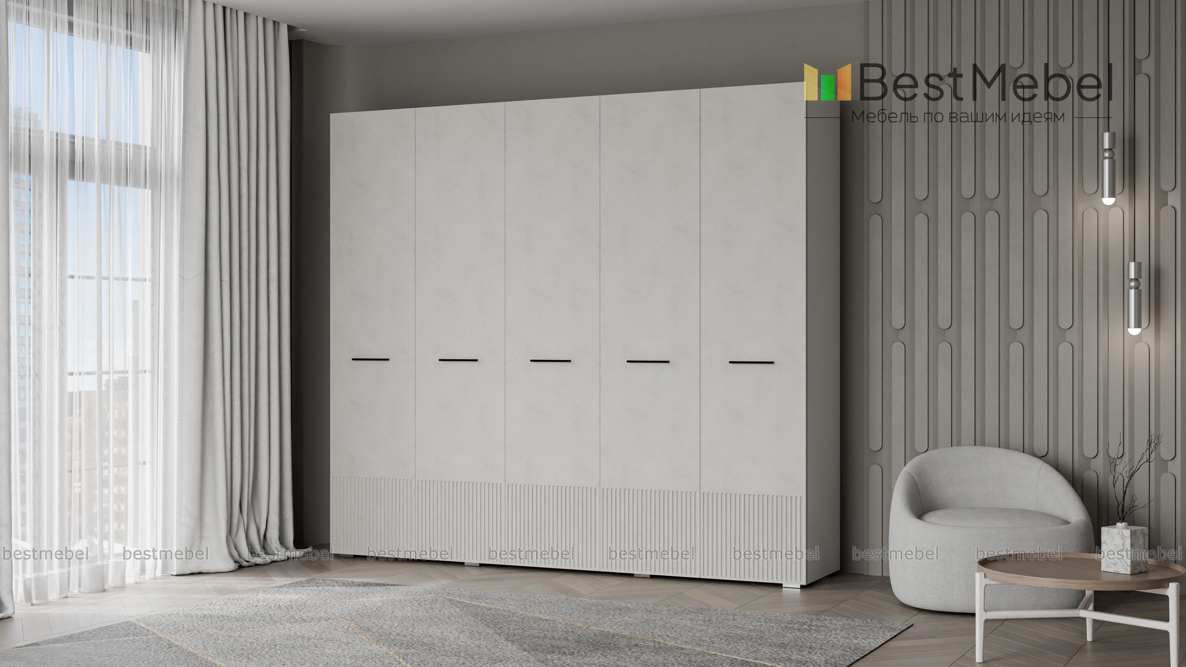 Шкаф распашной Декарт 5 BMS сочетает простую традиционную форму и актуальный дизайн. На сплошном светлом фасаде из МДФ выделяются поперечные ручки-скобы и фрезерованный рельеф, создавая визуально легкую конструкцию. Пятидверный гардероб позволяет организовать хранение с помощью пары штанг, вместительных верхних и бельевых полок. Купить шкаф распашной Декарт 5 BMS в удобном размере и любых оттенках из каталога вы сможете на сайте нашего интернет-магазина.