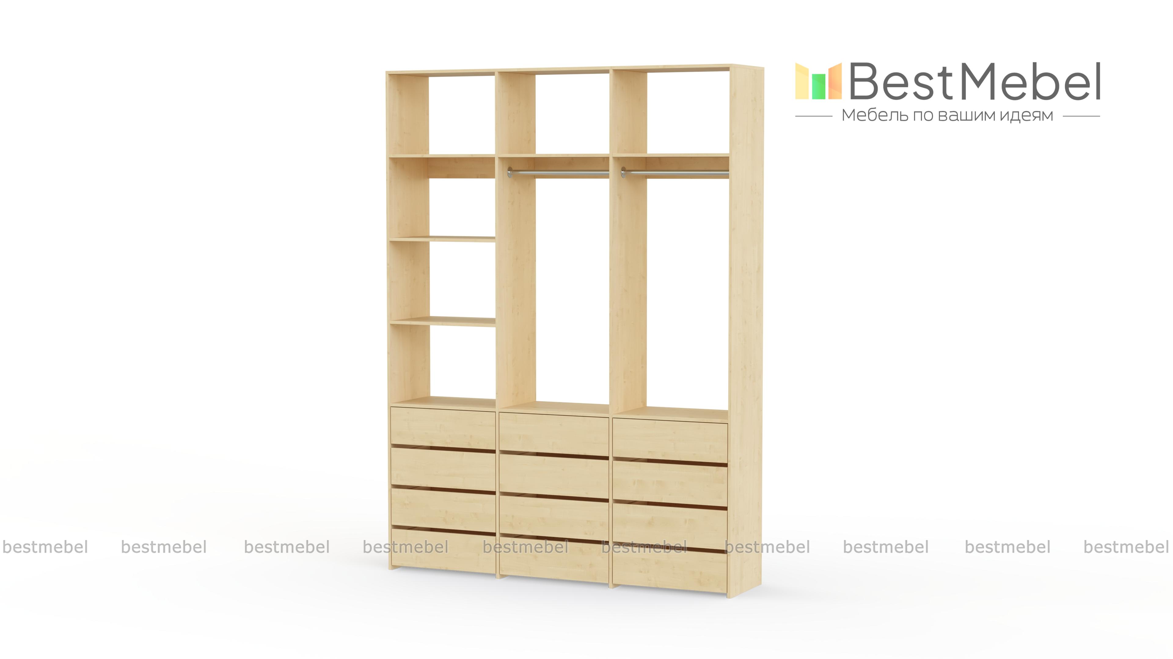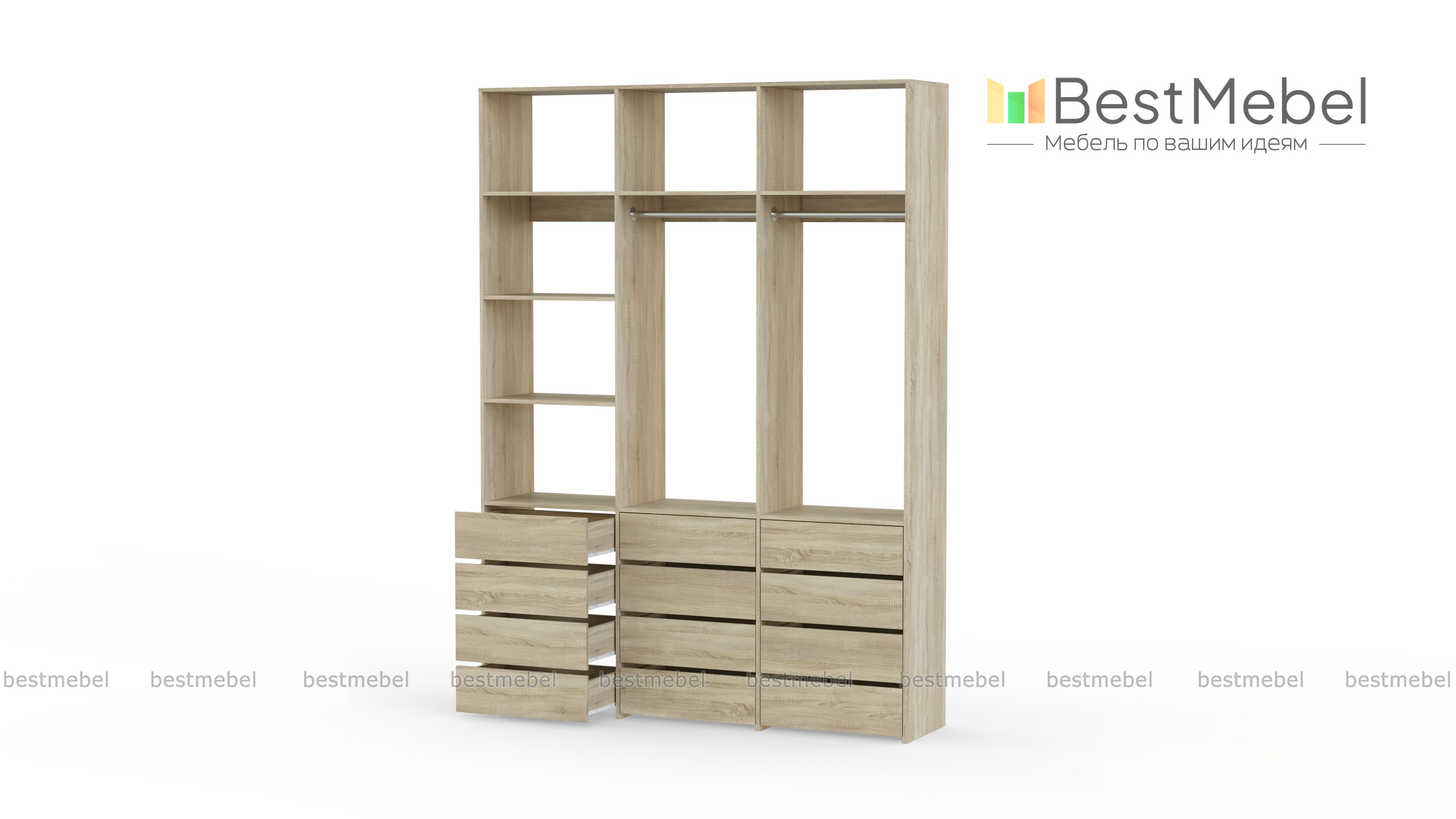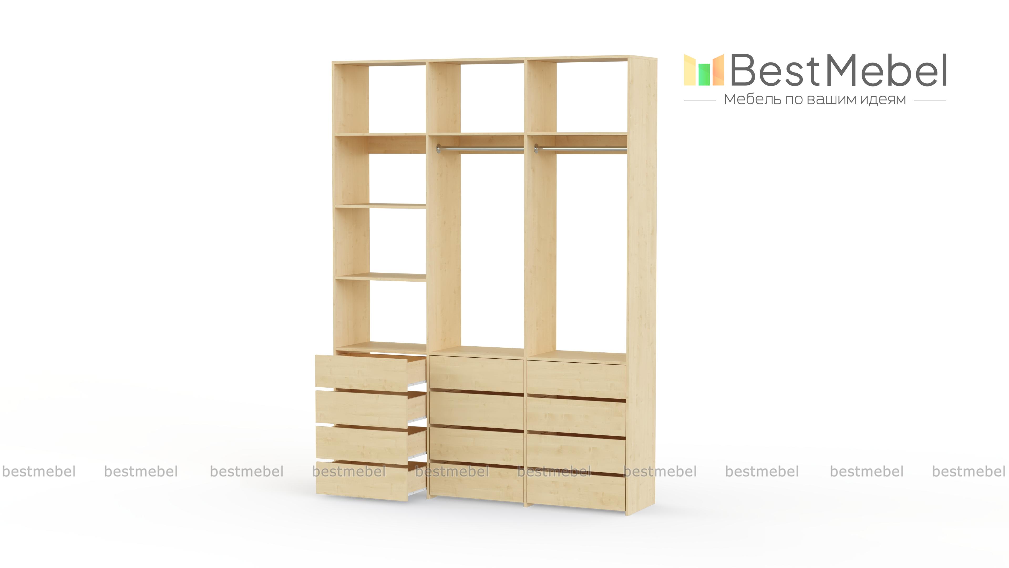 Стеллаж для одежды Мирта 48 BMS имеет минималистичный и функциональный дизайн. Трехсекционная конструкция включает в себя штанги для вешалок с одеждой, выдвижные ящики для белья и верхние полки, отделение слева для удобства также разделено двумя полками. Материал изготовления — прочная и долговечная ламинированная плита. Купить стеллаж для одежды Мирта 48 BMS, выполненный по индивидуальным размерам, вы сможете недорого на сайте нашего интернет-магазина.