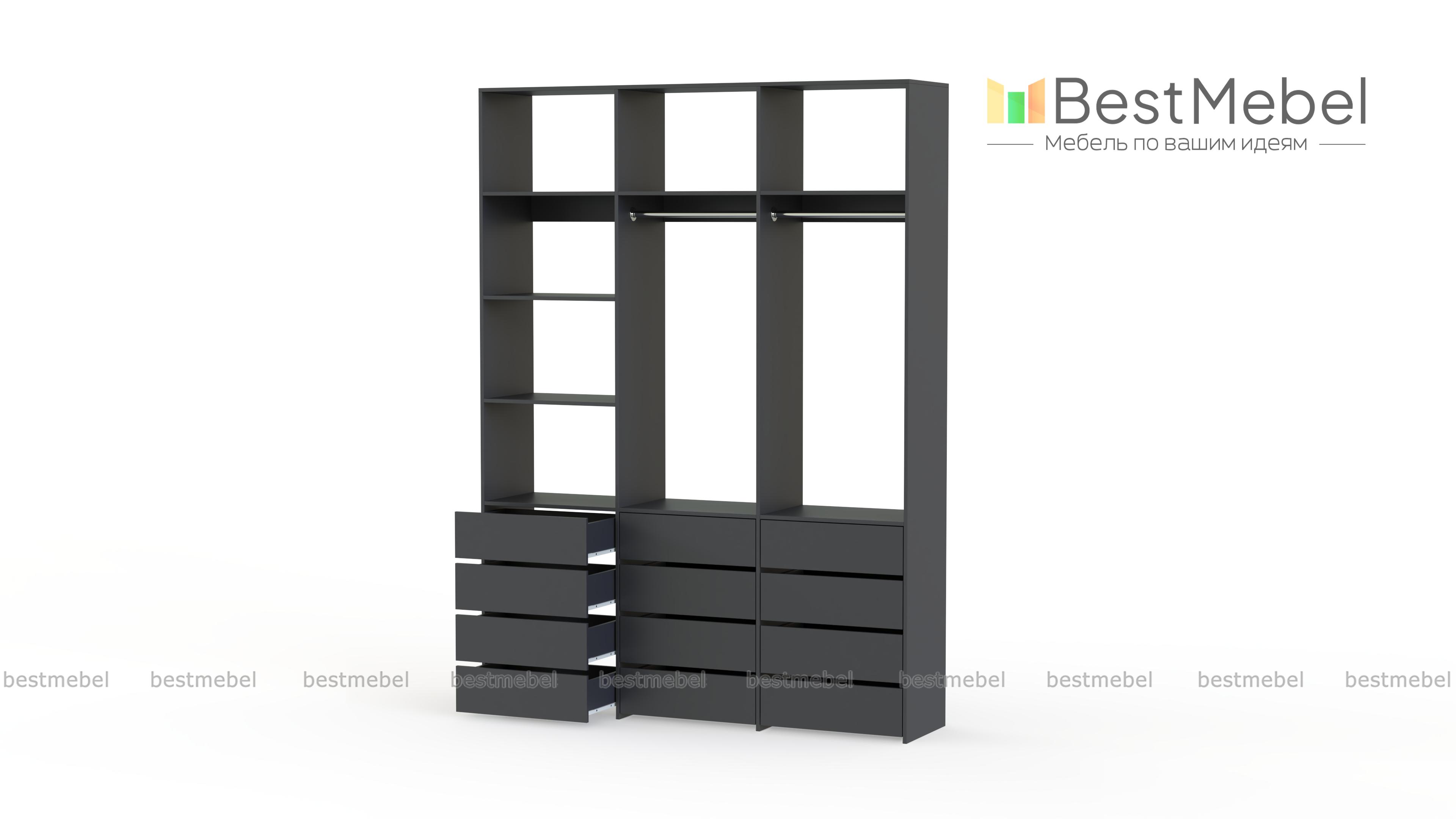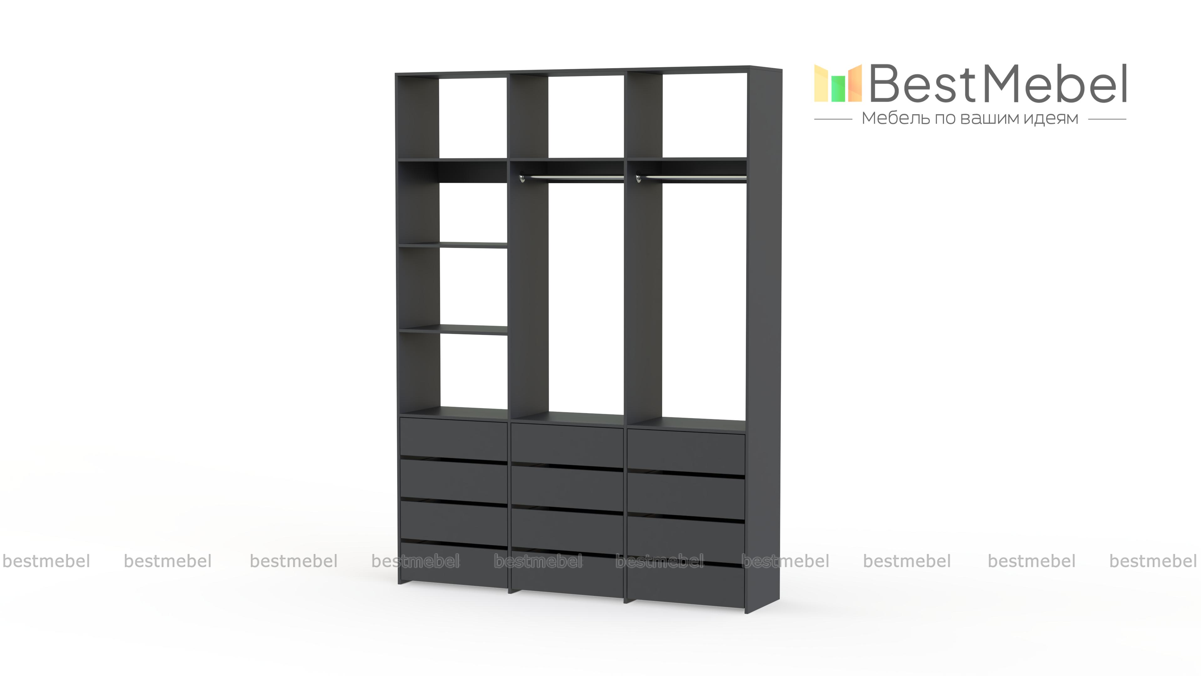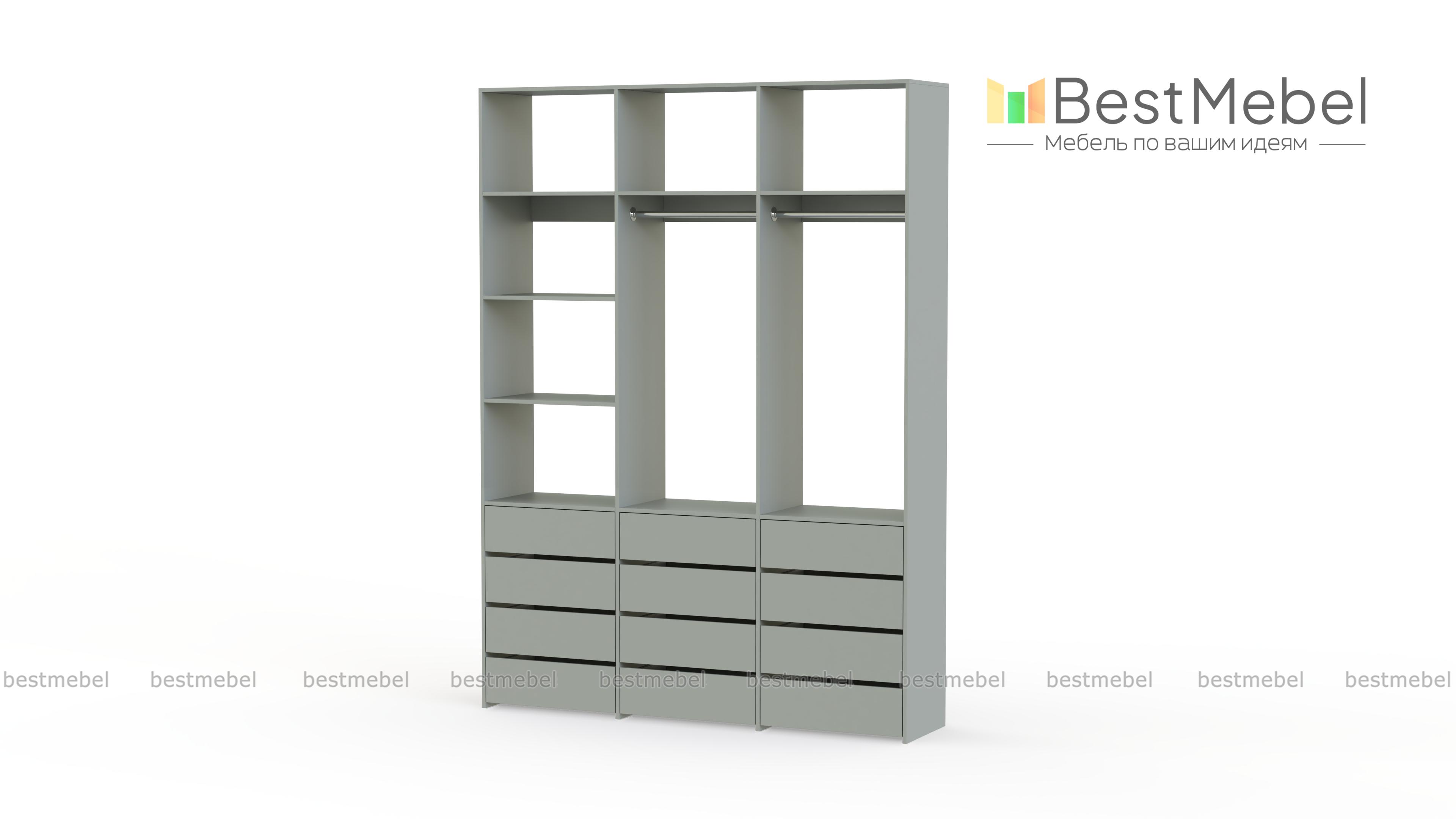 Стеллаж для одежды Мирта 48 BMS имеет минималистичный и функциональный дизайн. Трехсекционная конструкция включает в себя штанги для вешалок с одеждой, выдвижные ящики для белья и верхние полки, отделение слева для удобства также разделено двумя полками. Материал изготовления — прочная и долговечная ламинированная плита. Купить стеллаж для одежды Мирта 48 BMS, выполненный по индивидуальным размерам, вы сможете недорого на сайте нашего интернет-магазина.