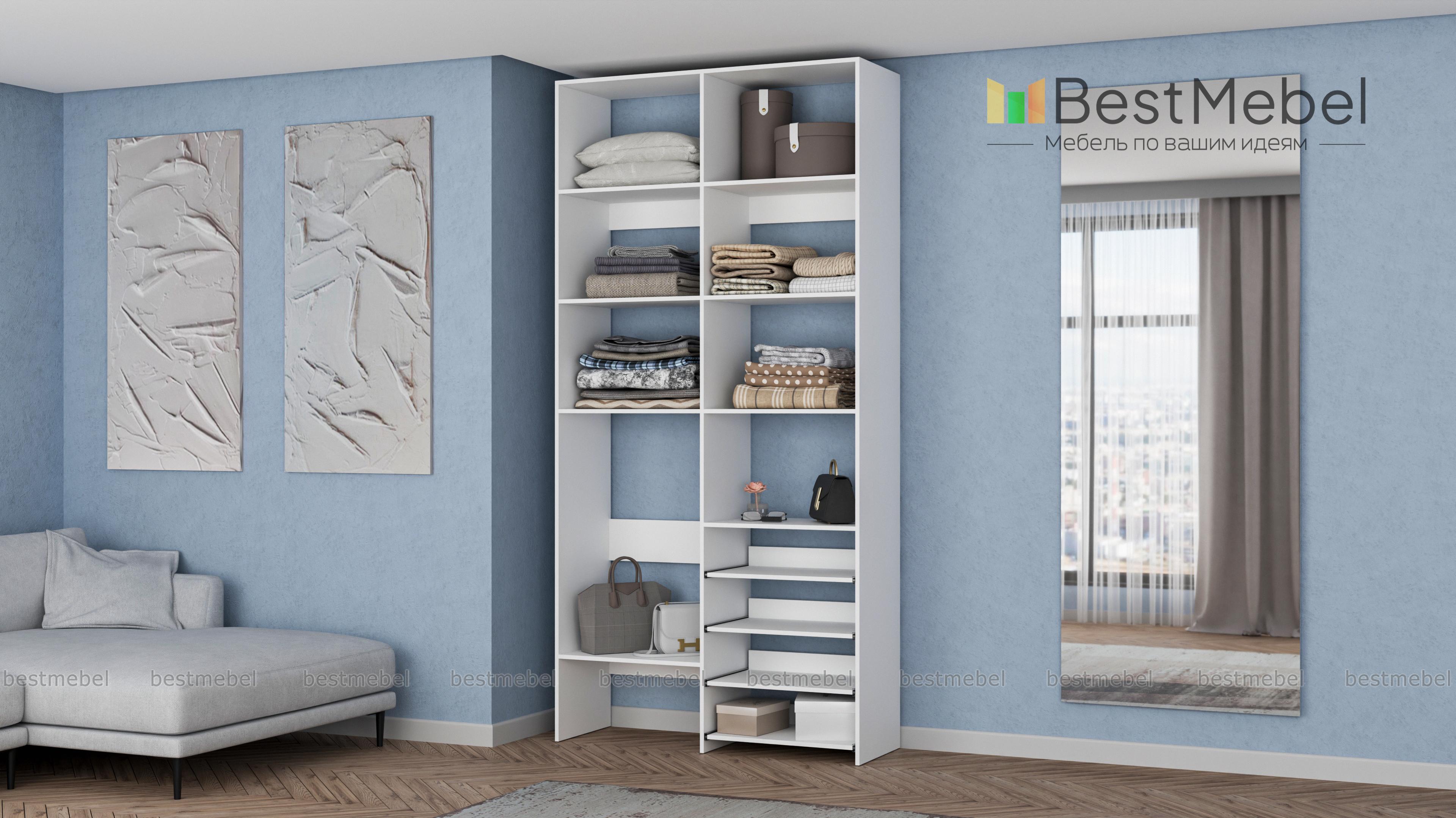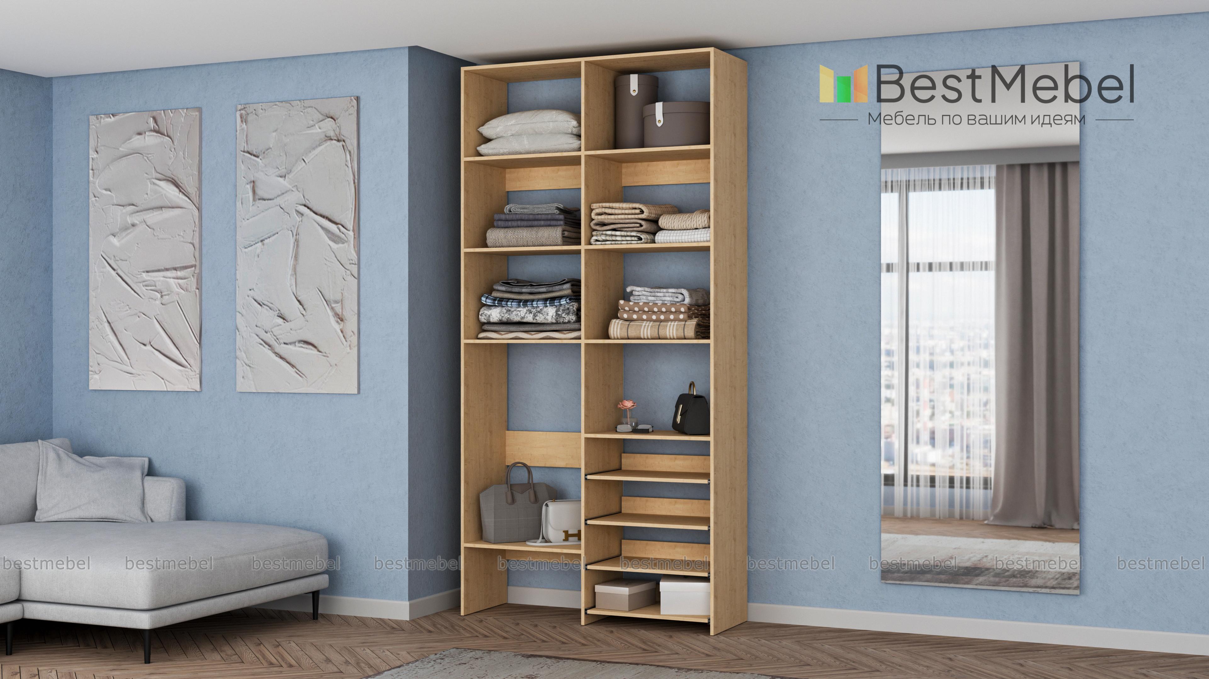 Стеллаж для одежды Мирта 80 BMS подойдет для комнат малого метража, где важна компактность. Модификация с открытыми секциями разных размеров и полками на направляющих оптимальна, если нужно хранить сложенную одежду, обувь, коробки и корзины с вещами. Базовый природный оттенок стеллажа и простая форма отлично смотрятся в любом современном интерьере. Купить стеллаж для одежды Мирта 80 BMS в необходимом размере и цвете вы сможете на сайте нашего интернет-магазина.