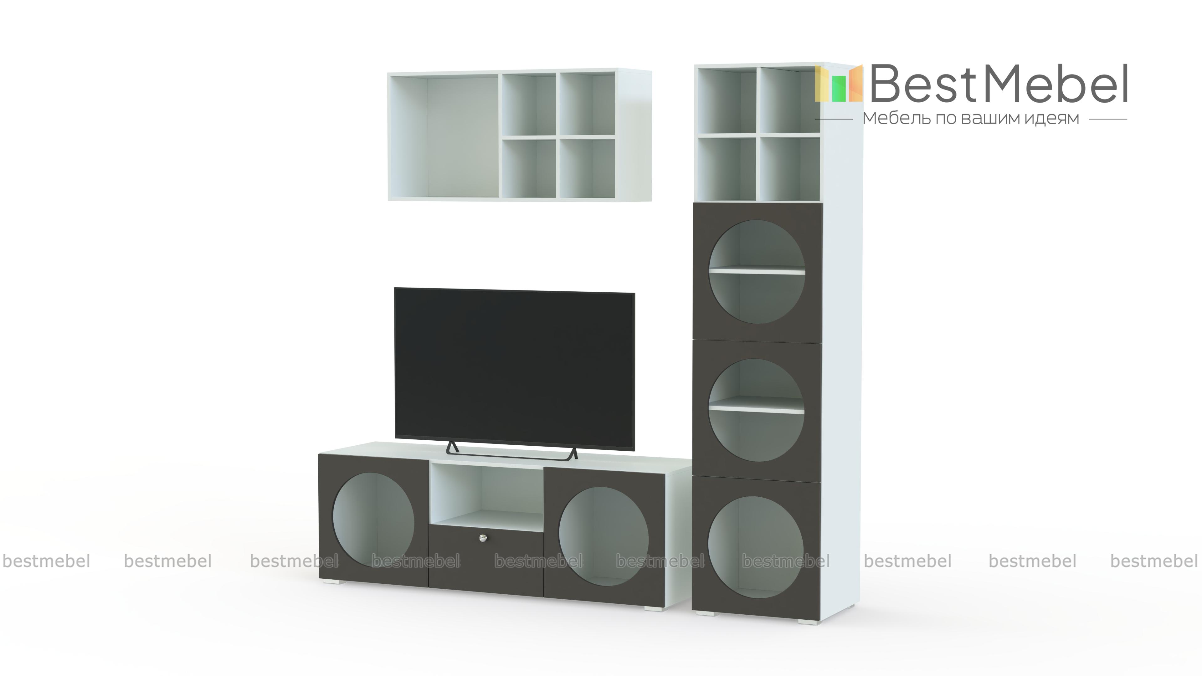 Стенка для гостиной Авелин 2 BMS сочетает в себе эстетику и практичность. Современная модульная композиция, выполненная в базовых оттенках, включает в себя широкую телевизионную тумбу, стеллаж и навесную полку. Интересную геометрию создают открытые круглые полки, в которых можно расположить книги и журналы, посуду и интерьерные аксессуары. Купить стенку для гостиной Авелин 2 BMS приглашаем в наш интернет-магазин с изготовлением по индивидуальным размерам.