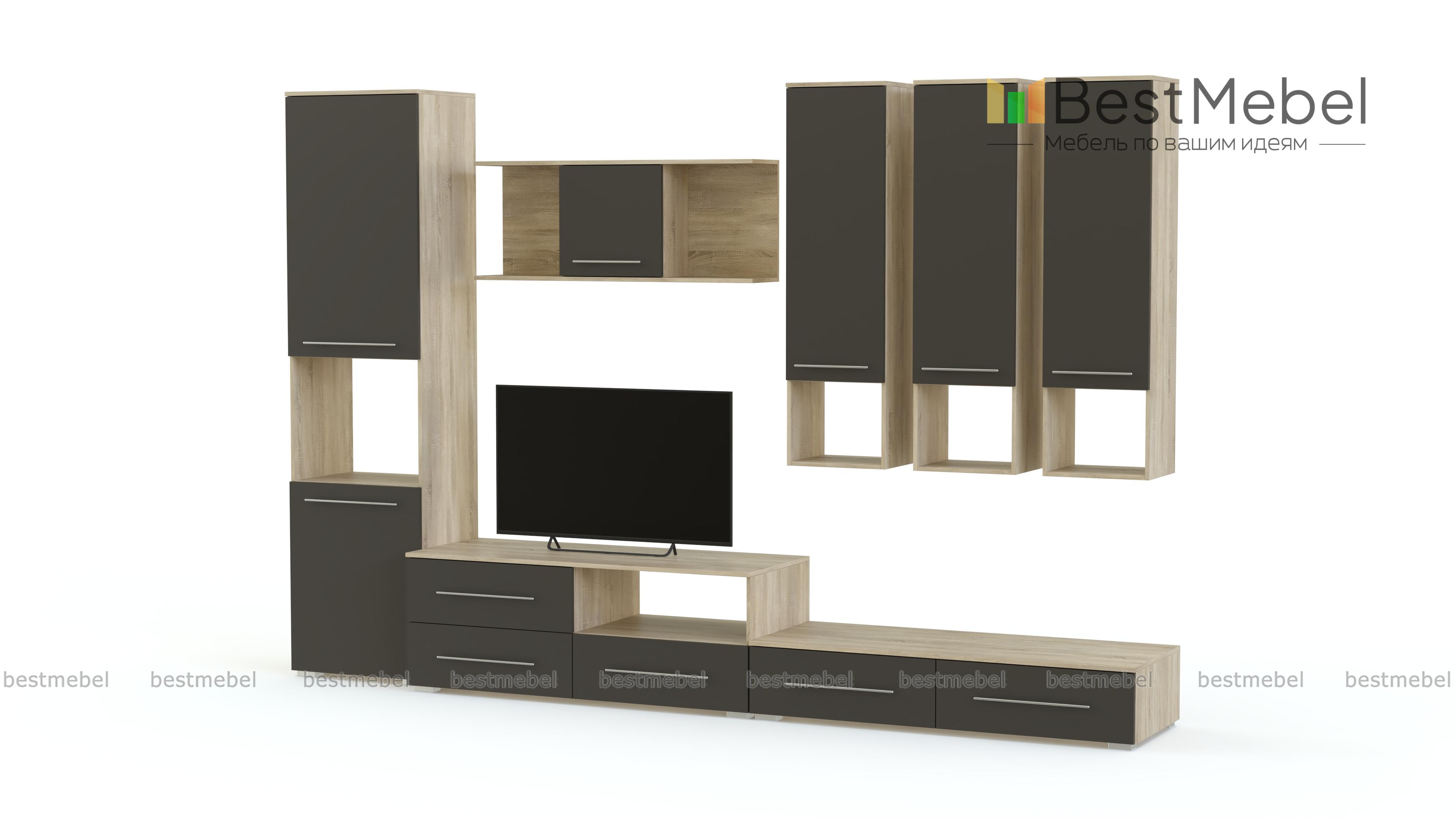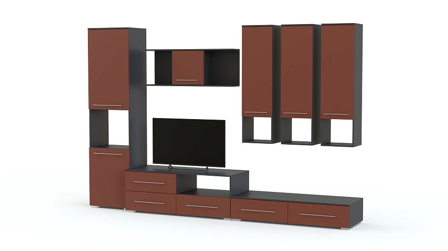 Стенка Грация 6 BMS – это визуальная легкость и функциональность современного дизайна. Напольные и навесные элементы модульной системы выполнены в сочетании графитовых тонов и цветного оттенка, которое гармонично впишется и в просторные, и в малогабаритные помещения. В комплект входят низкая тумба с надстройкой под ТВ, распашной пенал с нишей и навесные комбинированные шкафчики. Лаконичные по форме, модули легко комбинируются друг с другом. Купить стенку Грация 6 BMS для интерьера гостиной в стиле минимализм приглашаем в наш интернет-магазин по отличной цене.