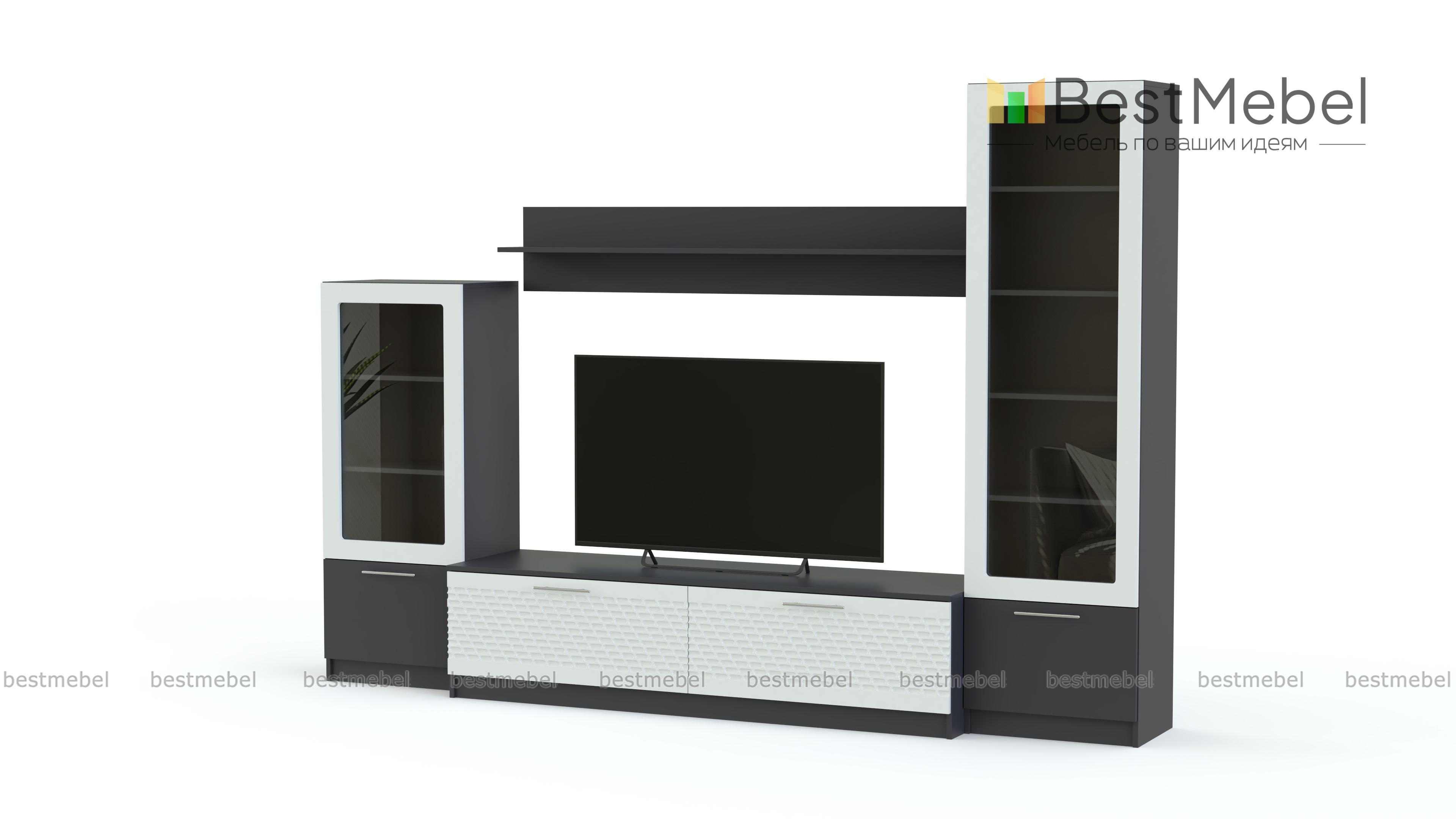 Стенка в гостиную Блеск 30.1-3D BMS – практичная модульная конструкция для современных интерьеров. Отдельные предметы вы сможете разместить по своему вкусу и гармонично вписать комплект в помещения любой планировки. Стенка включает в себя широкую низкую тумбу под ТВ, навесную открытую полку и две комбинированные витрины – большую и малую. Ярким акцентом в домашней меблировке станут цветные матовые фасады с 3D рисунком. Купить стенку в гостиную Блеск 30.1-3D BMS, эффектную и функциональную, приглашаем в наш интернет-магазин.