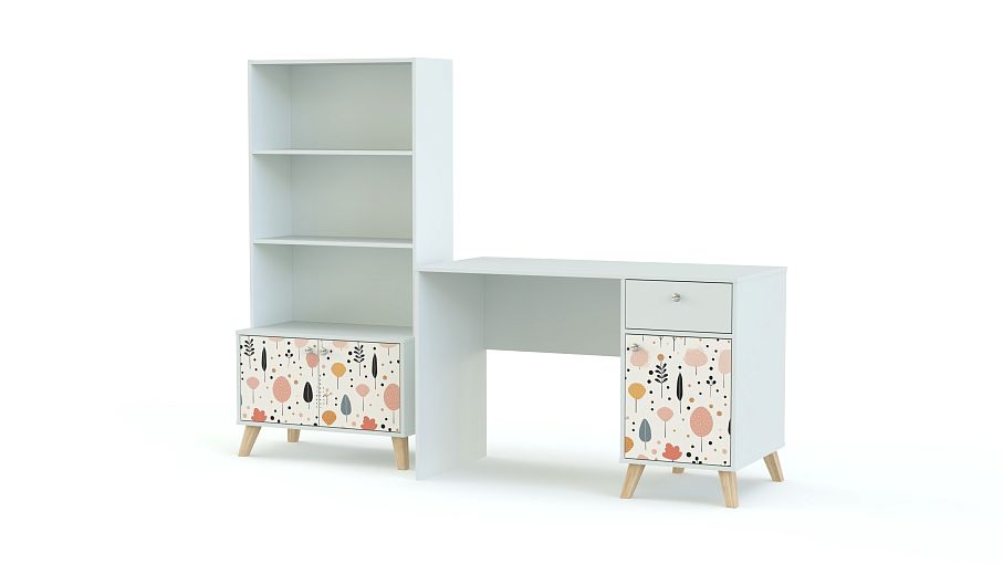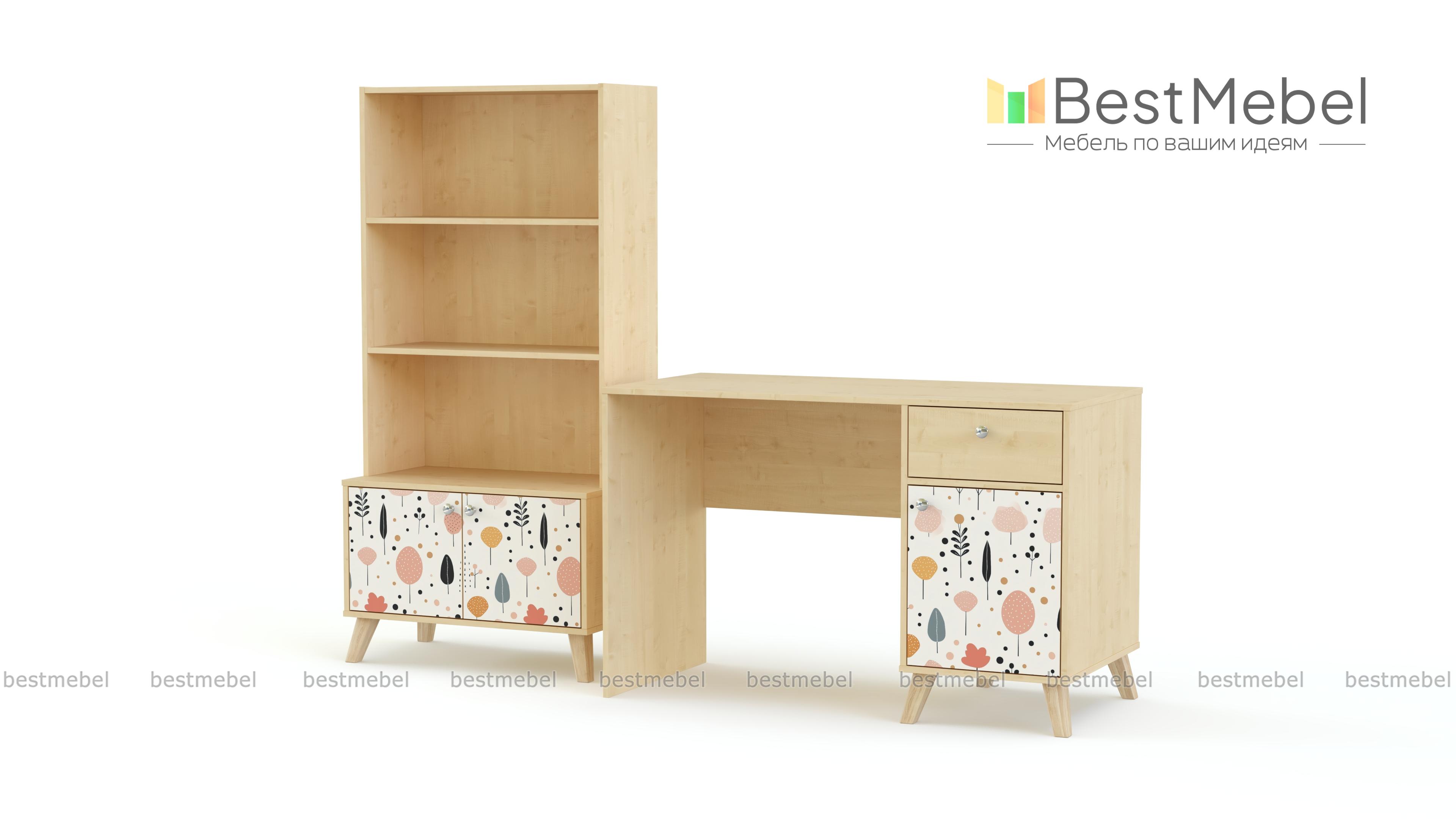 Стол письменный Эльза 7 BMS дополнен стеллажом, на котором в порядке разместятся учебные пособия, канцелярские принадлежности и приятные мелочи. Классическая прямоугольная модель с тумбой и просторной рабочей поверхностью выглядит легкой за счет высоких ножек. Универсальную светлую палитру композиции разбавляют нежные акценты фотопечати на распашных фасадах. Купить стол письменный Эльза 7 BMS вы сможете в нашем интернет-магазине, самостоятельно подобрав размеры и цветовую гамму.