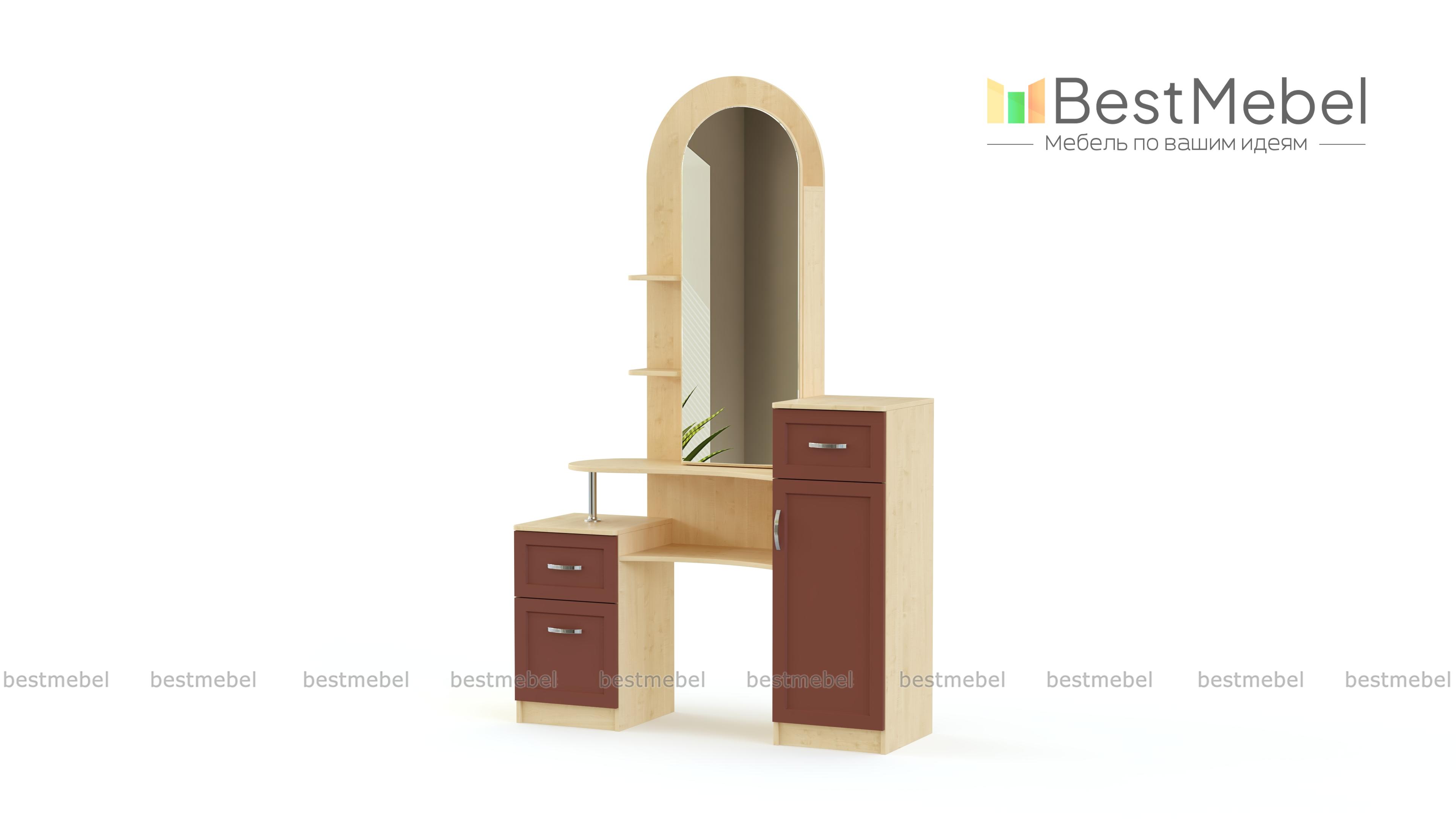 Классическое трюмо оригинального дизайна Камелия BMS подойдет для оформления классических спален и гостиных. Благодаря конструкции, модель не только привлекательна внешне, но и на редкость функциональна. Перед большим зеркалом в полный рост можно не только делать макияж, но примерить одежду, а откинув зеркальную дверцу, вы найдете несколько полок для мелочей. Интересно расположение небольшой тумбы и комода, а металлическая фурнитура и асимметричные линии столешницы смотрятся особенно необычно.