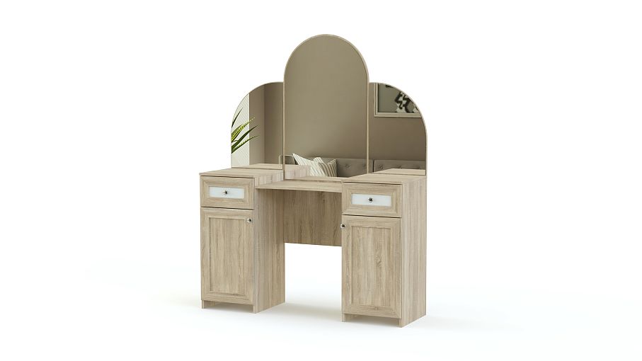 Элегантная модель для роскошной спальни в классическом стиле. Необычно декорированное, традиционное трехстворчатое зеркало особенно удобно для создания причесок и макияжа. Косметические средства смогут храниться в выдвижных ящиках боковых тумб или на полках за распашными дверцами. Благодаря насыщенным естественным цветам, изящному декору и неброской матовой золотистой фурнитуре туалетный столик Типони 2 BMS прекрасно впишется в интерьер и создаст в вашей комнате атмосферу уюта.