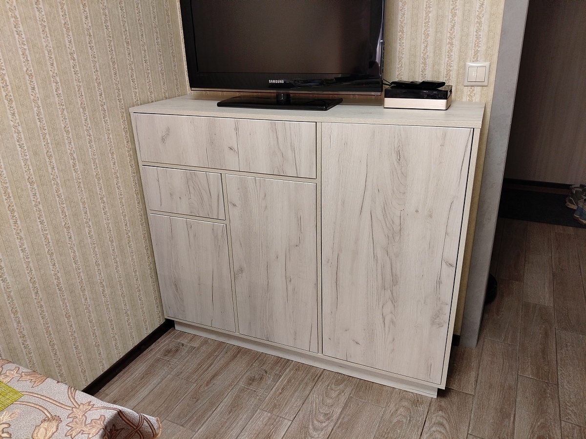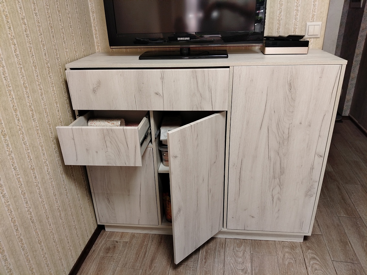 Тумбу заказали в своих размерах и цвете дуб крафт белый. В целом, мы ей очень довольны. Быстрое изготовление, отсутствие царапин и сколов, тактильно приятный материал. В процессе сборки возник вопрос. Почему "задняя стенка ДВП в паз" состоит из 3 частей? Ожидали ее цельной или хотя бы из 2х частей, чтобы верх и низ фиксировался в пазах. И, конечно, хотелось бы более подробную инструкцию по сборке. Для тех, кому может понадобится, прилагаю размеры упора-защелки с толкателем, чтобы правильно выставить его на дверцах и ящике.