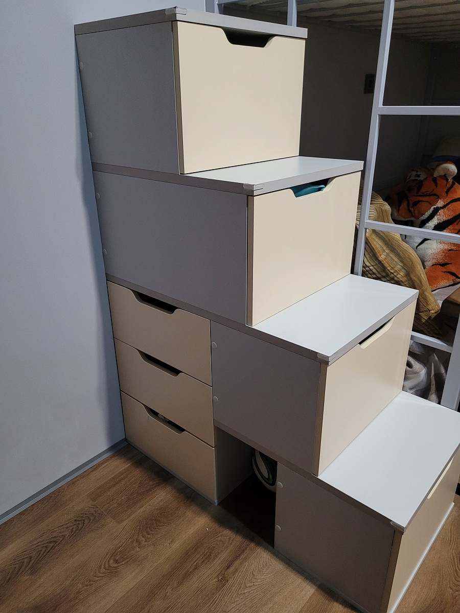 Заказывала две штуки для детских кроватей-чердак. По функционалу лучше этой модели, на просторах интернета,  я не нашла. Здесь же настолько интересной мне показалась модель, что остановилась на ней. Сборка оказалась не самой простой, т.к. много ящиков надо было собрать, да ещё и умножить все старания на два. Из положительных моментов - на изготовление ушло совсем не много времени, без возрастания цены сделано усиление платформ за счёт толщины древесной плиты( у нас лестницы для подростков с 42 размером стоп и 60+ кг), все составляющие без брака и на каждой единице составляющей стоит номер, благодаря которому, весь этот конструктор хорошо собирается. Что хочется посоветовать для покупателей - заказывайте хотя бы минимальную фаску для деталей лестницы- комода, иначе заметите, какие острые края и углы будут у изделия. Мне сразу захотелось поставить силиконовые уголки. Ведь это и тактильно слишком остро и сколы могут образоваться в дальнейшем на этих тревожных местах. И производителю - может стоит добавить ещё одну ступень(ящик) с фасада. Ведь такой разбег получается большой для стандартной высоты и, соответственно, ящики тяжеловаты. Вот с торца ящики просто прекрасны. И ход вперёд у них лёгкий и задумка замечательная - столько полезного места задействовано. В целом изделие рекомендую, как и производителя.