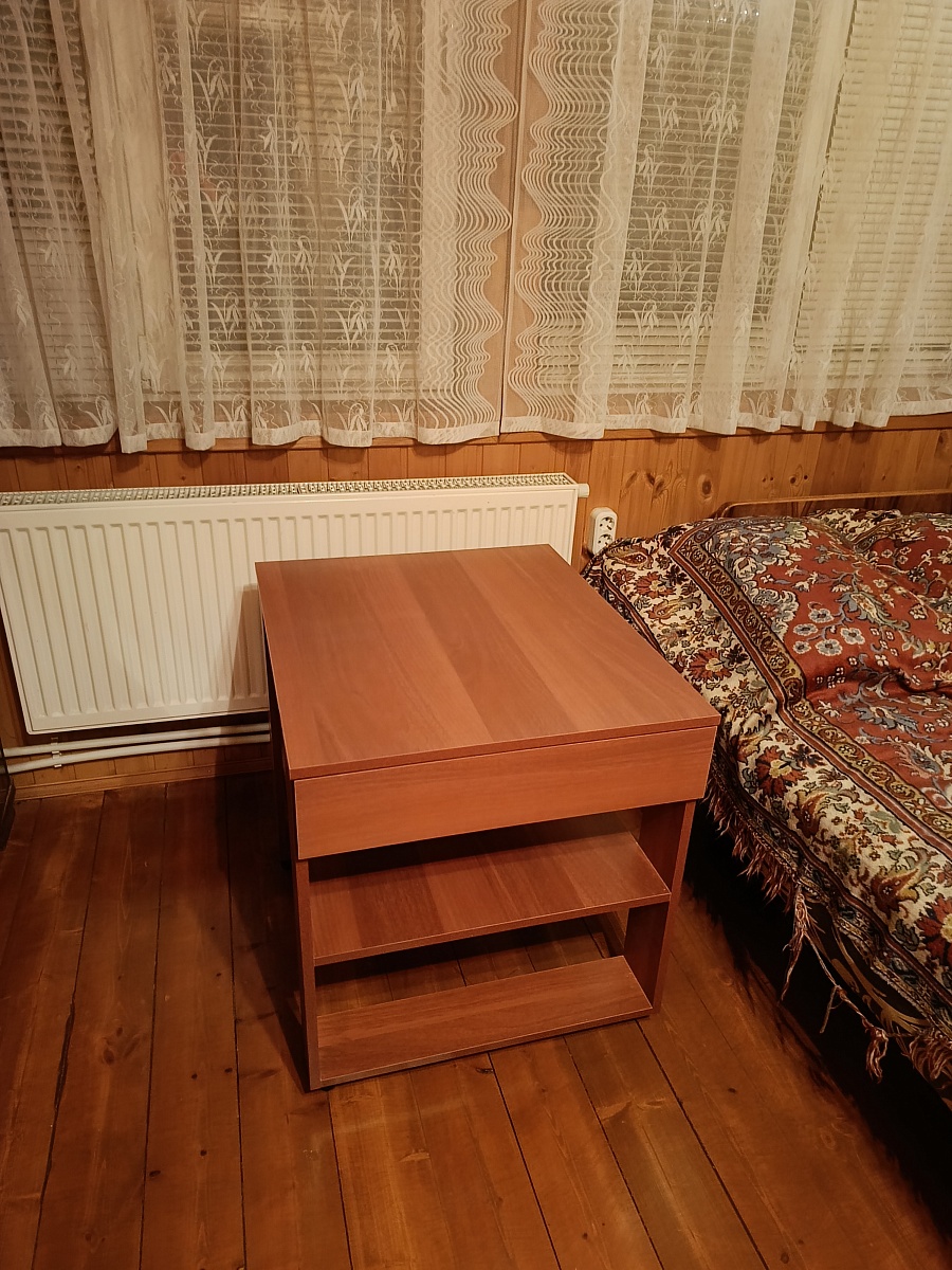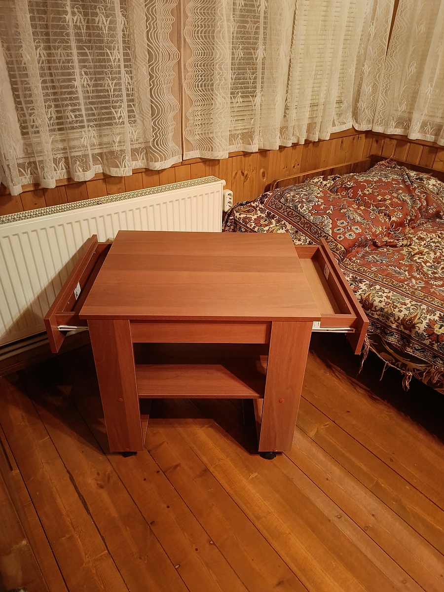 Отличный столик с выдвижными ящиками, очень удобная высота (650мм) хоть из положения лёжа (смотреть тв), хоть сидя(ноги под столик можно поставить).