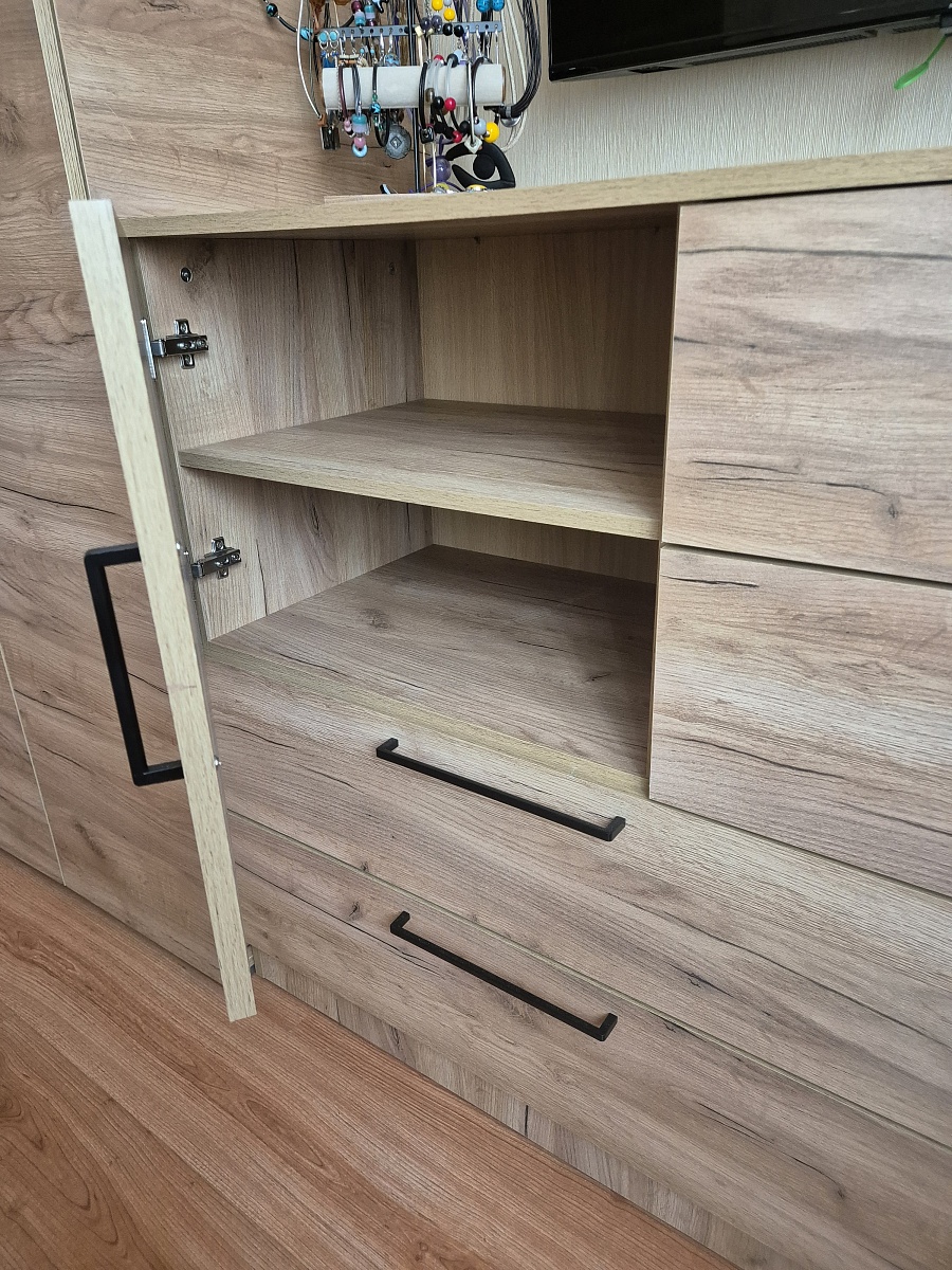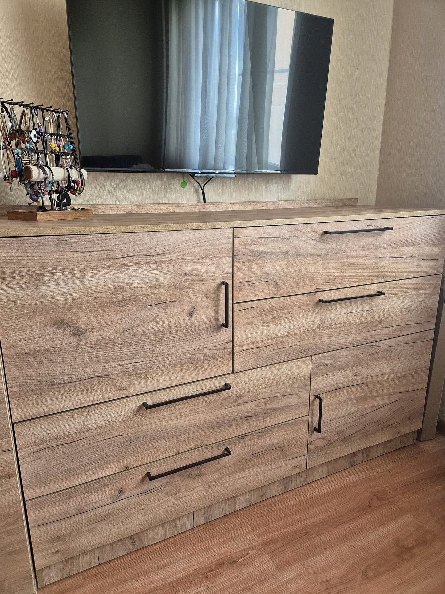 Заказ 00000694204, изделие ЭСКИЗ №00000694204 Комод Нордли Nordli 11 (1500х990х470)Были куплены изначально шкафы - цвет золотой дуб крафт у другого производителя. На разных сайтах искала возможность изготовить комод такого же цвета по своим размерам (стоимость получалась дороже, чем я отдала за шкафы )). Случайно наткнулась на бестмебель. Выбрала цвет, свой размер и то, что хочу. Т.к. основной критерий- ящики для нижнего белья и полки для хранения постельного белья и подушек. Единственное, что докупила отдельно - ручки. Т.к. у шкафов уже ручки были. Привезли всё в срок, мой папа собрал его. Я очень довольна .